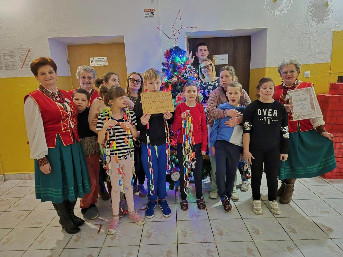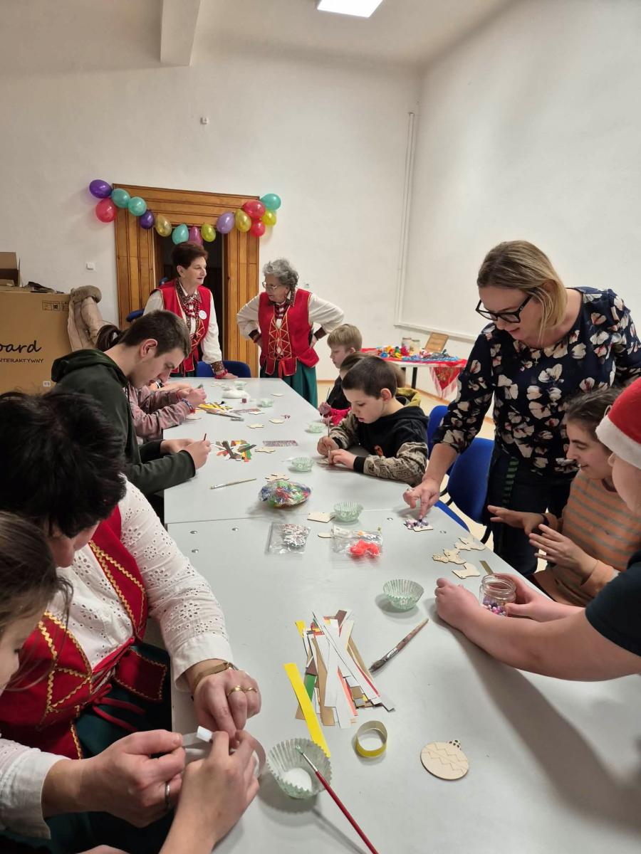 Podczas zajęć uczestnicy wykonywali tradycyjne papierowe łańcuchy oraz ozdabiali drewniane zawieszki na choinkę, tworząc własnoręczne, niepowtarzalne ozdoby. Panie z Koła zaprezentowały także swoje piękne regionalne stroje, wzbudzając ogromne zainteresowanie i podziw. Nie zabrakło również opowieści o świątecznych zwyczajach i tradycjach, które od lat są pielęgnowane w ich społeczności. Ciepła atmosfera i otwartość Gospodyń sprawiły, że czas spędzony razem był nie tylko twórczy, ale także pełen wzruszeń i radości.